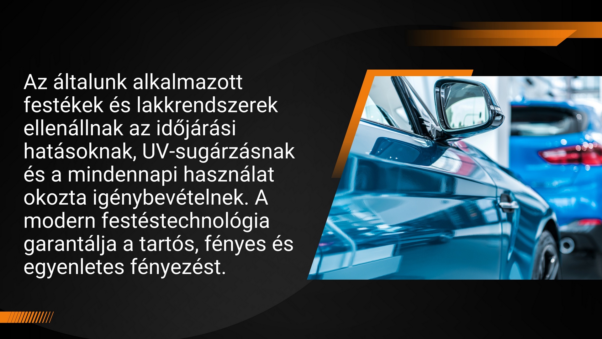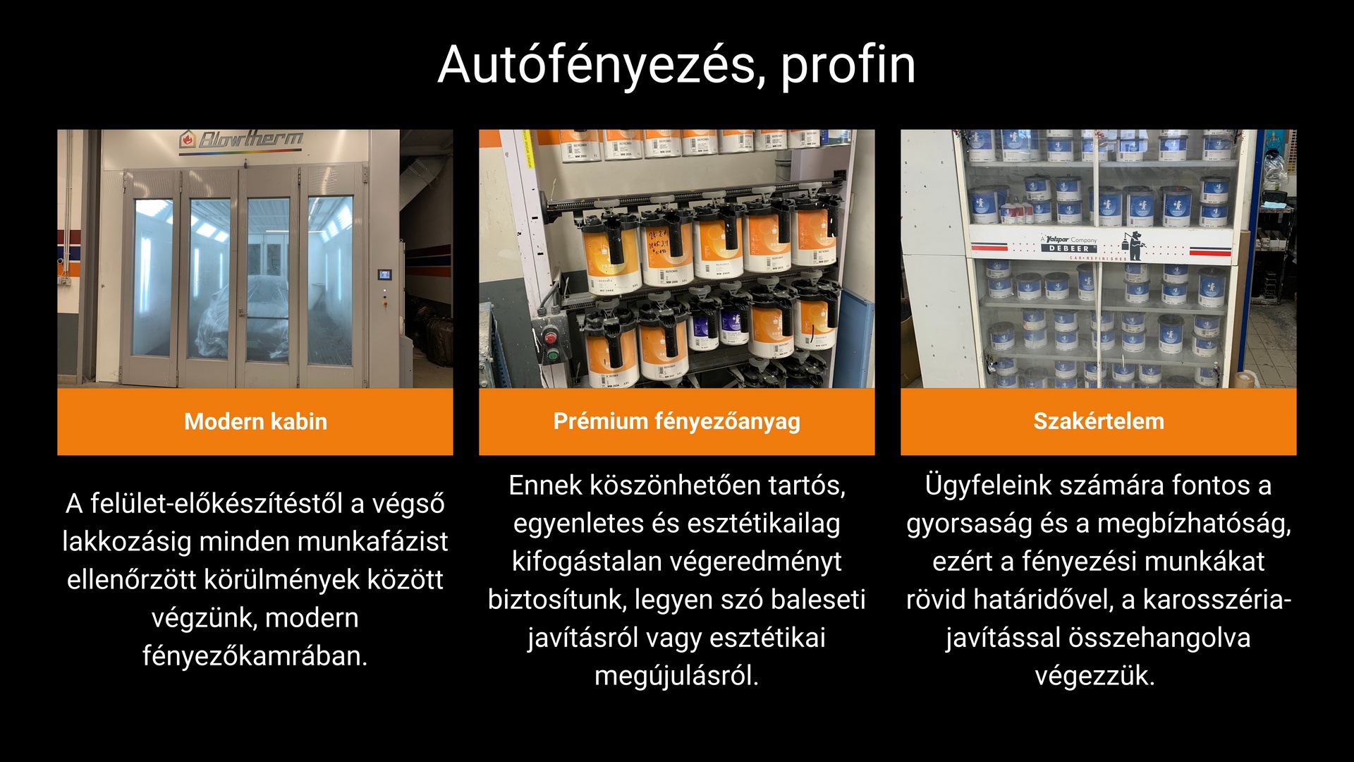 Cégünk teljes körű karosszéria javítást és autófényezést vállal modern technológiával, tapasztalt szakemberekkel. Legyen szó kisebb sérülésről, baleseti kárról vagy teljes fényezésről, autója nálunk a legjobb kezekben van.